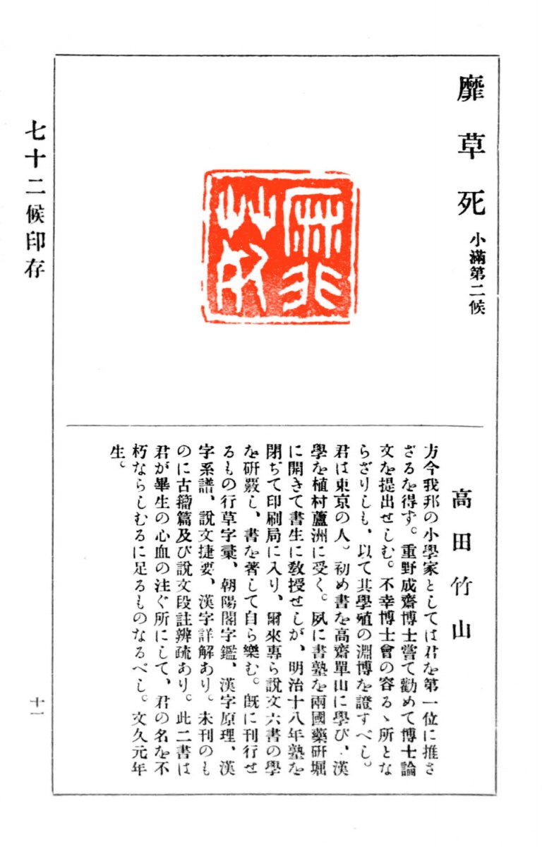 七十二候印存 小満第二十三候 靡草死(薺(なずな)など田に生える草が枯れる)/高田竹山(たかだ ちくざん)明治ー昭和期の書家、説文学者、漢学者。