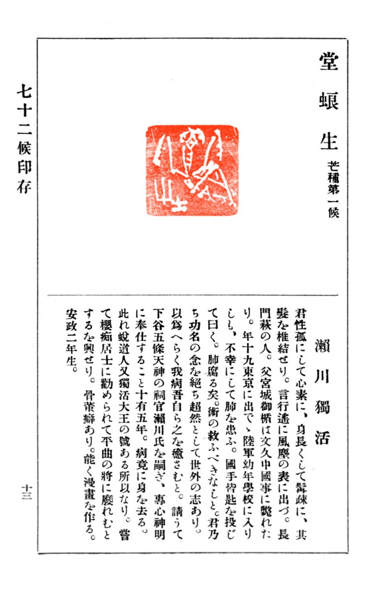 国立国会図書館デジタルコレクションで見つけたのは七十二候印存という書籍で、明治の文人72名が自ら篆刻した各七十二候の名称の印影集です。印存とは印章を押捺あるいは印刷して本の体裁にしたものです。