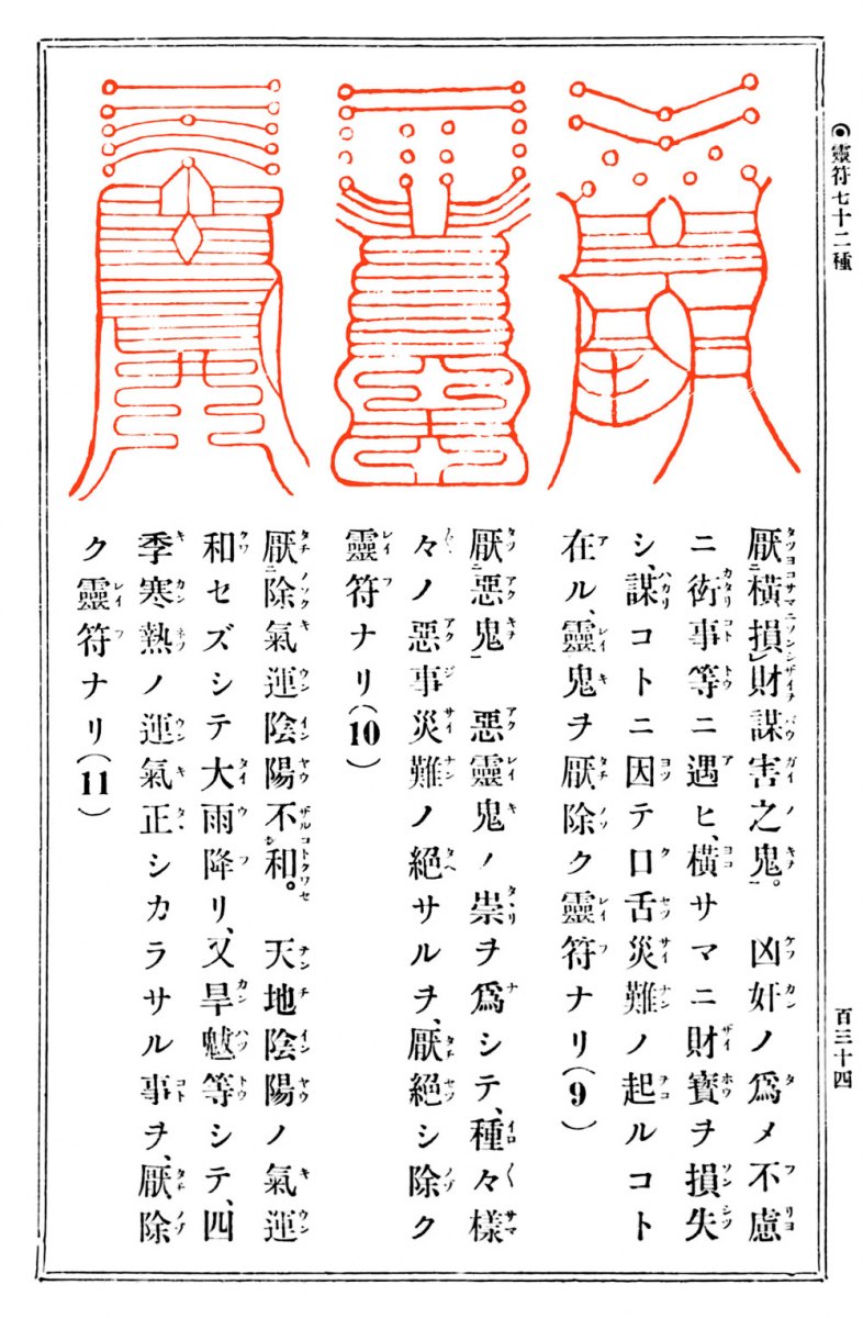 09◉厭横損財謀害之鬼。(よこさまに ざいを そんし、ぼうがいの きを たつ。) 〔解釈〕これは不慮の脅迫に逢い又思いがけなく財宝を損失し、計略に引っかかって言い争い、災難の起こる時にこの霊符を祀ればその災いは治まる。 10◉厭惡鬼(あくきを たつ) 〔解釈〕これは悪鬼が祟りを起こして様々な悪い事や災難が続く時に、この霊符を祀れば直ちに治まる。 11◉厭除氣運陰陽不和。(きうん いんよう わせざることを たちのぞく。) 〔解釈〕これは天地陰陽の気運が乱れ、大雨降り又日照りなどして四季寒熱の気候がおかしい時にこの霊符を祀れば治するものとす。