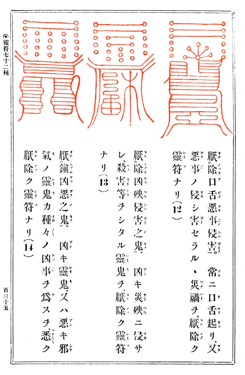 書籍には鎮宅七十二霊符の起源についての記述があり、参考のために注釈や読点をつけたり、旧字を新字に、またカナをかなにして、読みやすくしました。カッコ内は(読み/意味)。