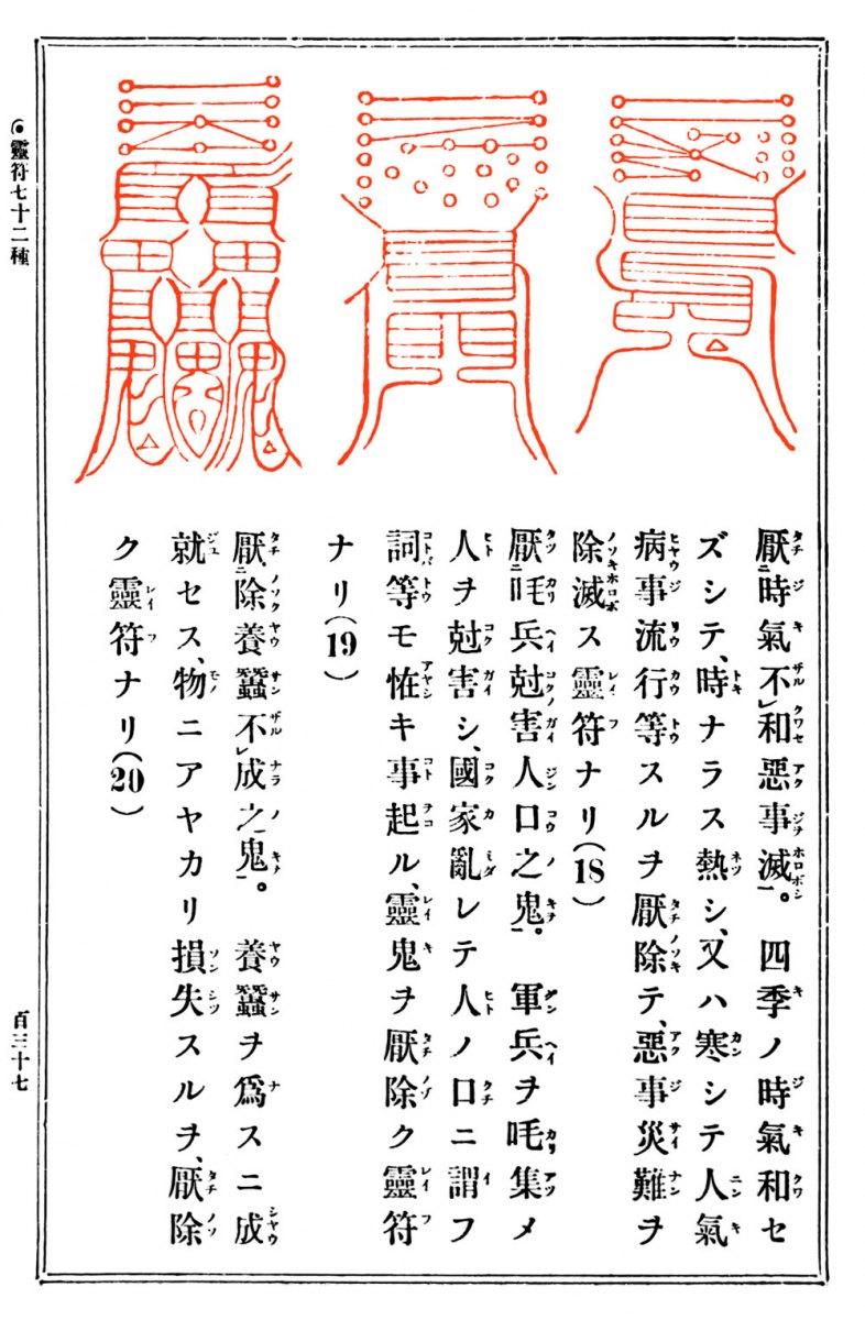 18◉厭時氣不和惡事滅。(じき かせざる あくじを ほろぼし たち。) 〔解釈〕これは四季の気候が乱れた時、暑かったり寒かったりして悪病流行などする時にこの霊符を祀れば必ずその家には悪病が入リこまない 19◉厭口毛兵尅害人口之鬼。(かりへい こくのがい じんこうの きを たつ。) 〔解釈〕これは、兵士を集め、人を害し国家を乱し、怪しき言葉が吐かれるなどの災いを起こす悪鬼を祓いよける時に用いる霊符なり 20◉厭除養蠶不成之鬼。(ようさん ならざるの きを たちのぞく。) 〔解釈〕これは蚕を養ってもよくできず損失する時にこの霊符を祀れば必ず蚕はよくできて商売繁昌するものとす