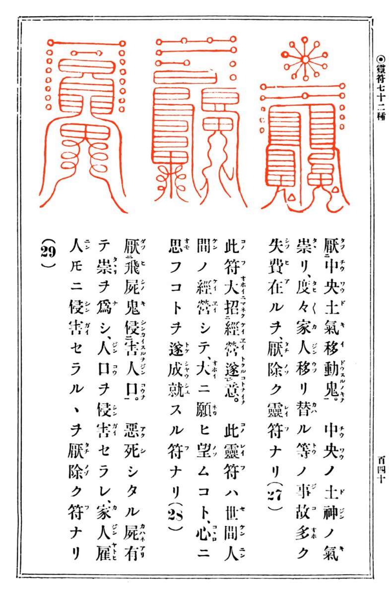 書籍には鎮宅七十二霊符の起源についての記述があり、参考のために注釈や読点をつけたり、旧字を新字に、またカナをかなにして、読みやすくしました。カッコ内は(読み/意味)。