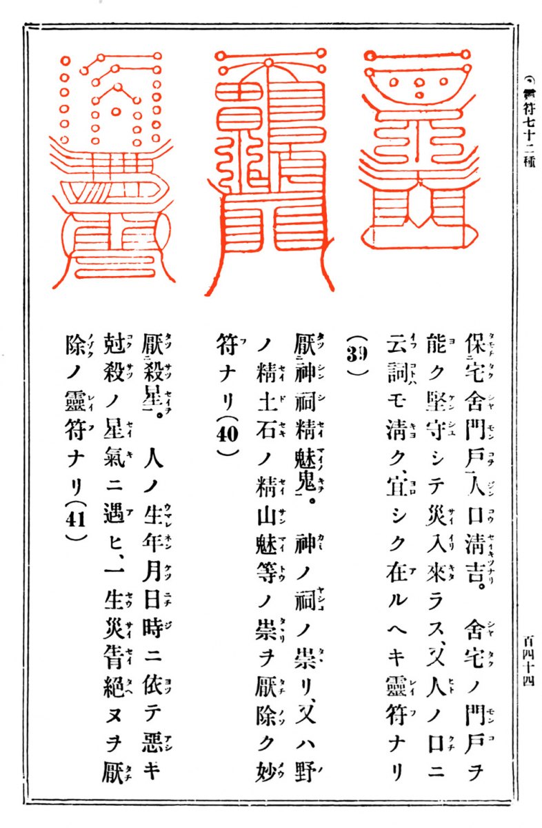 39◉保宅舎門戸人口清吉。(たくしゃ もんこを たもち、じんこう せいきつなり。) 〔解釈〕これは家の門戸をよく堅め守りて災いの入り来らず、又人の言葉も清く美しくなる家内円満の霊符なり。 40◉厭神祠精魅鬼。(しんし せいまいの きを たつ。) 〔解釈〕これは神の呪い、又はいろいろの怪しきことがある時にこの霊符を祀れば必ず治すものとす。 41◉厭殺星。(さつせいを たつ。) 〔解釈〕これは人の生年月日時において悪しき星の邪気に逢い一生災いの絶えぬ時にこの霊符を祀れば必ず開運す。
