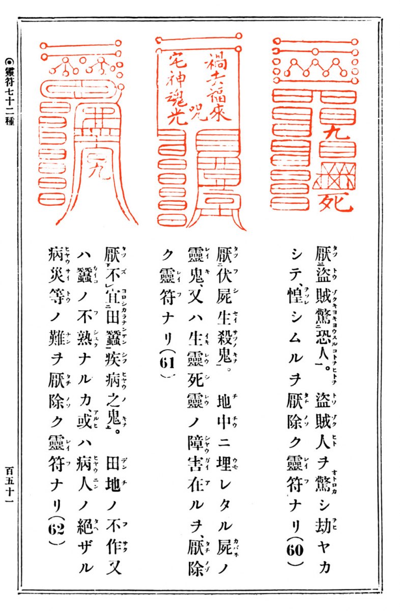 60◉厭盗賊驚恐人。(とうぞくの ひとを きょきょうすることを たつ。) 〔解釈〕これは盗賊に驚かされたり、脅されて恐ろしい思いをしたりする災いを祓い除ける霊符なり。 61◉厭伏屍生殺鬼。(ふし せいさつの きを たつ。) 〔解釈〕これは生霊、死霊の祟りをを祓い除ける時に用いれば大なる効験ある霊符なり。 62◉厭不宜田養蠶疾病之鬼。(てんさん よろしからず しっぺいの きを たつ。) 〔解釈〕これは田畑の不作また蚕のよくできず或は病人の絶えざる時それを祓いよけるに用いれば必ず大利益ある霊符とす。