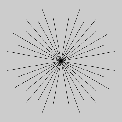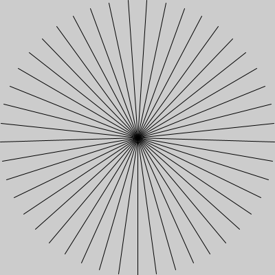 size(400, 400); translate(200, 200); //原点を移動 scale(1, -1); // Y軸を上下反転します int r = 200; // 円の半径 float x; //X座標 float y; //Y座標 float div=radians(8); //分割する角度をラジアンに変換 float th; //角度 //分割する角度を0から2πまで繰り返す for ( th=0 ; th <TWO_PI ; th+=div) { //円の公式 x=r*sin(th); y=r*cos(th); line(0, 0, x, y); } |