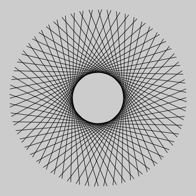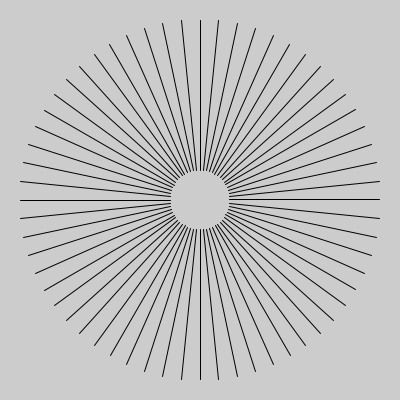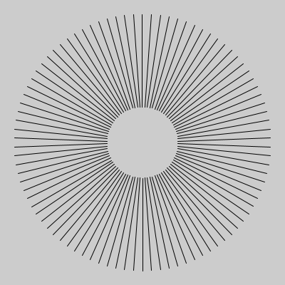 size(400, 400); translate(200, 200); //原点を移動 scale(1, -1); // Y軸を上下反転します int R1 = 50; // 小円の半径 int R2 = 180; //大円の半径 float x1, x2; //小円,大円のX座標 float y1, y2; //小円,大円のY座標 float div=radians(4); //分割する角度をラジアンに変換 float th; //角度 for ( th=0; th <TWO_PI; th+=div) { //小円 x1=R1*sin(th); y1=R1*cos(th); //大円 x2=R2*sin(th); y2=R2*cos(th); line(x1, y1, x2, y2); } |