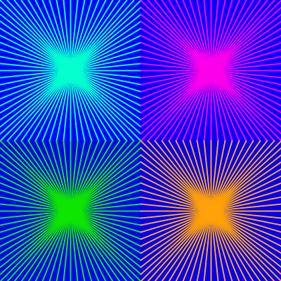 size(400, 400); background(0,0,255); int dt=10;//分割幅 int wd=200; //幅 int hd=200; //高さ int org=100; //中心座標 //右上 strokeWeight(2); //線幅 stroke(5, 255, 207); //線色 for (int i=0; i<4; i++) {//4回繰り返し for (int d=0; d<=wd-dt; d+=dt) { line(org, org, d, 0); //上 line(org, org, d+dt, hd); //下 line(org, org, wd, d); //右 line(org, org, 0, d+dt); //左 } switch(i) { case 0: //右上 stroke(252, 0, 236); translate(200, 0); break; case 1: // 左下 stroke(14, 229, 0); translate(-200, 200); break; case 2: // 右下 stroke(255, 161, 8); translate(200, 0); break; } } |
