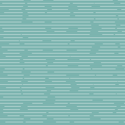 //=========================================== // ランダムな長さの線 //=========================================== // CreationDate: 2025年2月24日 月曜日18:13:13 //=================【環境設定】================ size(400, 400); //画面サイズ background(124,180,175); //=================【初期設定】================ int dt=0; //移動量 stroke(255); //==================メイン==================== for (int i=0; i<6; i++) { for (int y=0; y<height; y+=10) { float rx = random(-20, 30); float rx2 = random(60, 80); line(rx+dt, y, rx2+dt, y); } dt+=75; //移動する } |