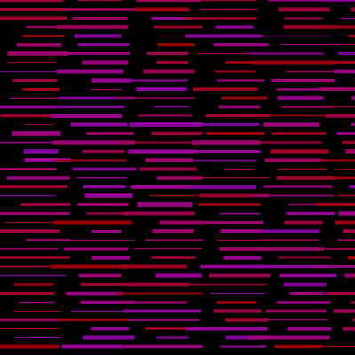 //=========================================== // ランダムな長さの線 //=========================================== // CreationDate: 2025年2月24日 月曜日19:01:50 //=================【環境設定】================ size(400, 400); //画面サイズ colorMode(HSB,100); background(0); //=================【初期設定】================ int dt=0; //移動量 strokeCap(SQUARE); //==================メイン==================== for (int i=0; i<6; i++) { for (int y=0; y<height; y+=10) { strokeWeight(random(1, 5)); stroke(random(80,100), 100, 60); float rx = random(-20, 30); float rx2 = random(60, 80); line(rx+dt, y, rx2+dt, y); } dt+=75; //移動する } |