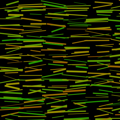 //=========================================== // ランダムな長さの線 //=========================================== // CreationDate: 2025年2月24日 月曜日19:09:58 //=================【環境設定】================ size(400, 400); //画面サイズ colorMode(HSB,100); background(0); //=================【初期設定】================ int dt=0; //移動量 strokeCap(SQUARE); //==================メイン==================== for (int i=0; i<6; i++) { for (int y=0; y<height; y+=10) { strokeWeight(random(1, 6)); stroke(random(10,30), 100, 60); float rx = random(-20, 30); float rx2 = random(60, 80); float ry = random(20); float ry2 = random(20); line(rx+dt, y+ry, rx2+dt, y+ry2); } dt+=75; //移動する } |
