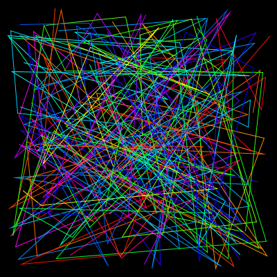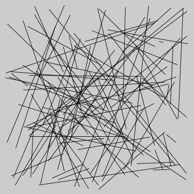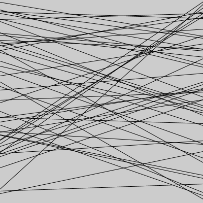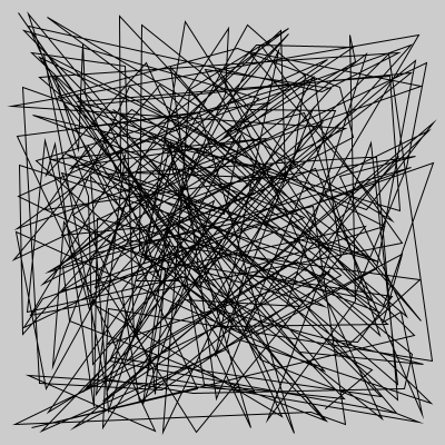 //=========================================== // ランダムな線 //=========================================== // CreationDate: 2025年2月24日 月曜日11:19:46 //=================【環境設定】================ size(400, 400); //画面サイズ //==================メイン==================== for (int i=0; i<100; i++) { float rx =random(10, 391);//ランダムなX始点を生成 float ry =random(10, 391);//ランダムなY始点を生成 float rx2 =random(10, 391);//ランダムなX終点を生成 float ry2 =random(10, 391);//ランダムなY終点を生成 line(rx, ry, rx2, ry2); //直線を描画 } |