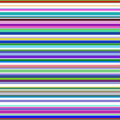 //=========================================== // 水平線をランダムに03 //=========================================== // CreationDate: 2025年2月24日 月曜日10:07:35 //=================【環境設定】================ size(400, 400); //画面サイズ background(255); //==================メイン==================== for (int i=0; i<100; i++) { float ry =random(0, height);//ランダムなY座標を生成 strokeWeight(random(1,10)); stroke(random(255), random(255), random(255)); line(0, ry, width, ry); //直線を描画 } |