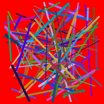 //=========================================== // ランダムな線02 //=========================================== // CreationDate: 2025年2月24日 月曜日11:27:24 //=================【環境設定】================ size(400, 400); //画面サイズ background(255,0,0); //==================メイン==================== for (int i=0; i<100; i++) { float rx =random(10, 391);//ランダムなX始点を生成 float ry =random(10, 391);//ランダムなY始点を生成 float rx2 =random(10, 391);//ランダムなX終点を生成 float ry2 =random(10, 391);//ランダムなY終点を生成 strokeWeight(random(1,10)); stroke(random(220), random(180), random(256)); line(rx, ry, rx2, ry2); //直線を描画 } |