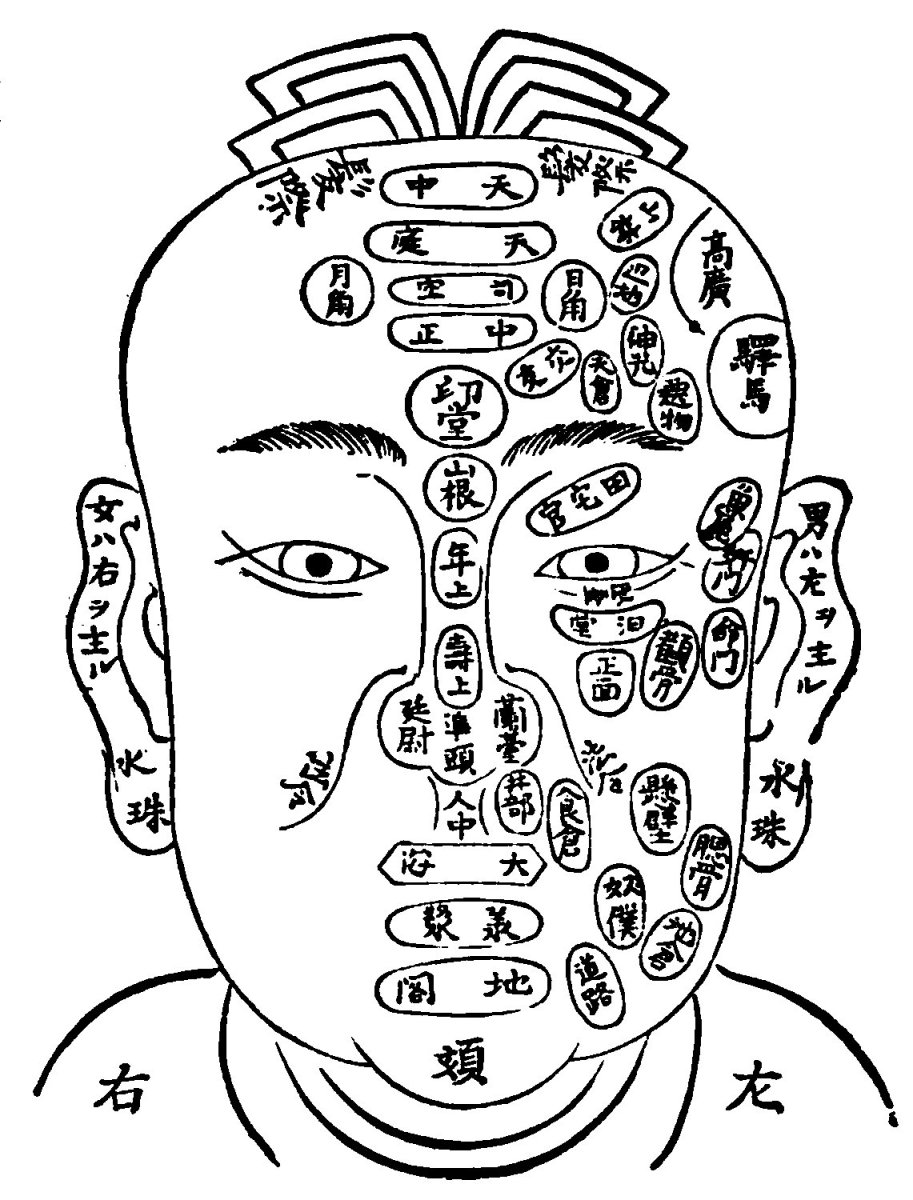 額には知恵、眉には徳、鼻には財運、頬には勇気──顔全体がまるで地図のように分割され、それぞれの部位が象徴的な意味を担っています。見る者は自然と、顔という平面を「読み解く」ことを求められます。つまり、人相図は“顔を地図化したグラフィック”とも言えます。