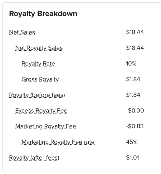 今回の改訂により、10%を超えると超過料金が課せられることになりました。またマーケティング手数料として物によって違いますがロイヤリティの最大50%が課せられることに。加えてEUやUKユーザーの購入には価格から20%の付加価値税が引かれたものにロイヤリティが計算されます。