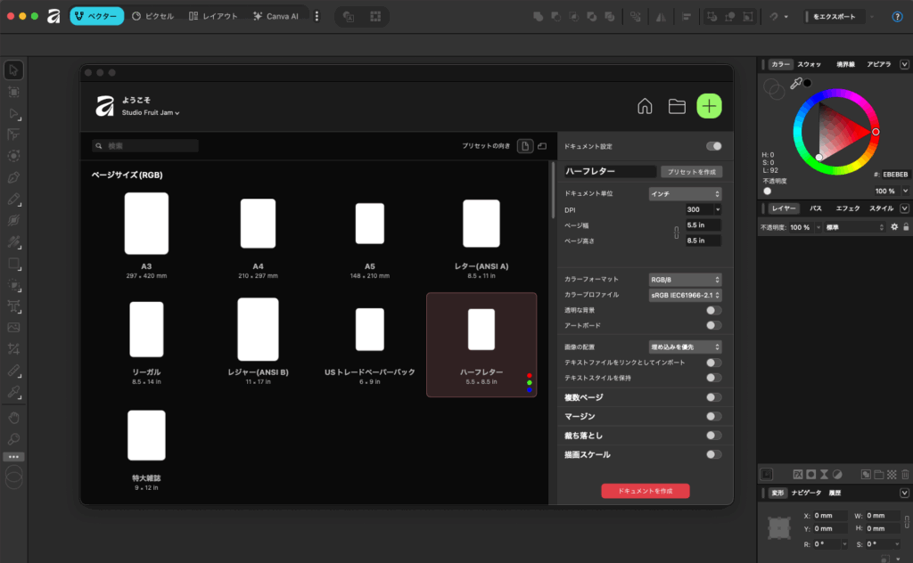 Affinityの Designer、 Photo、Publisher、Canva AIが一つに統合されて、Affinity by Canvaに生まれ変わりました。Canva AIを除き全てが無料となりました。上部のメニューでベクター、ピクセル、レイアウト、Canva AIに切り替えることができます。