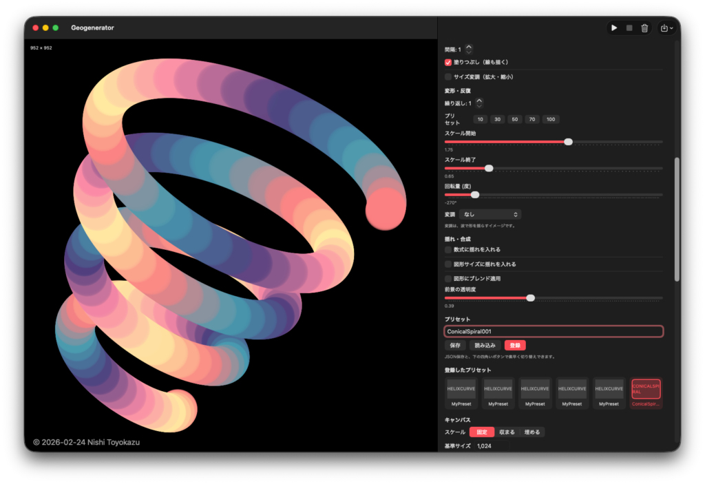 幾何学曲線、変形、色補間(Processingのlerp相当)、ペン設定、保存、プリセット……やりたいことを思いつく限り並べました。