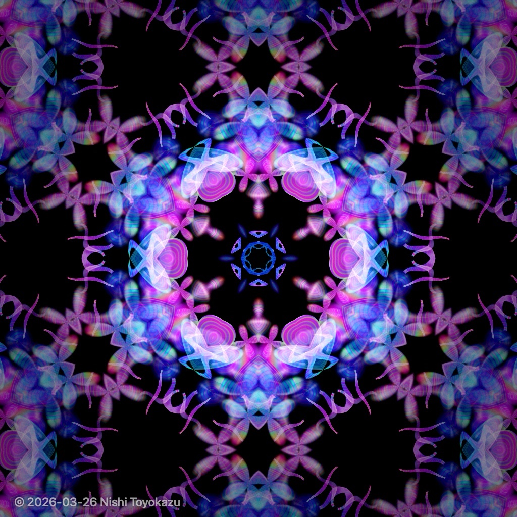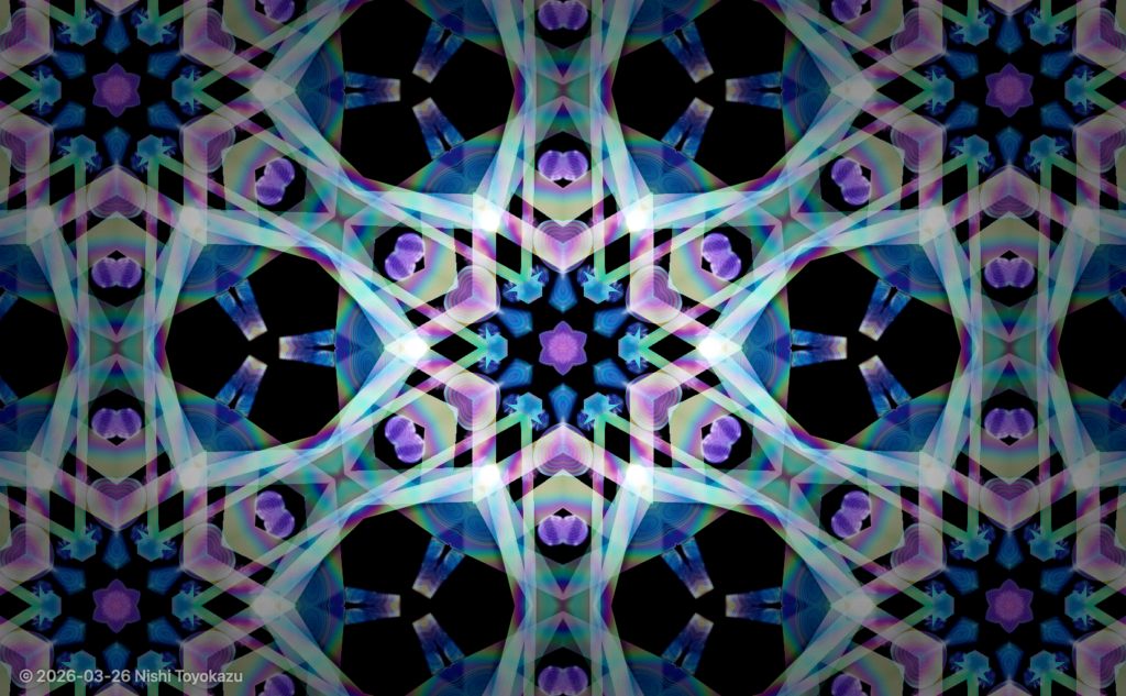 特にこだわったのは、「平面的な図形の繰り返し」に見えないことです。単なる幾何学模様ではなく、本物の万華鏡のように、光がにじみ、重なり、奥行きが感じられること。さらに、グロー効果は必須。色についても、ただの単色ではなく、オパールやシャボン玉、モルフォ蝶の羽のような、見る角度や動きによって印象が変わる偏光色、構造色、干渉色のような表現を取り入れたいと考えました。
