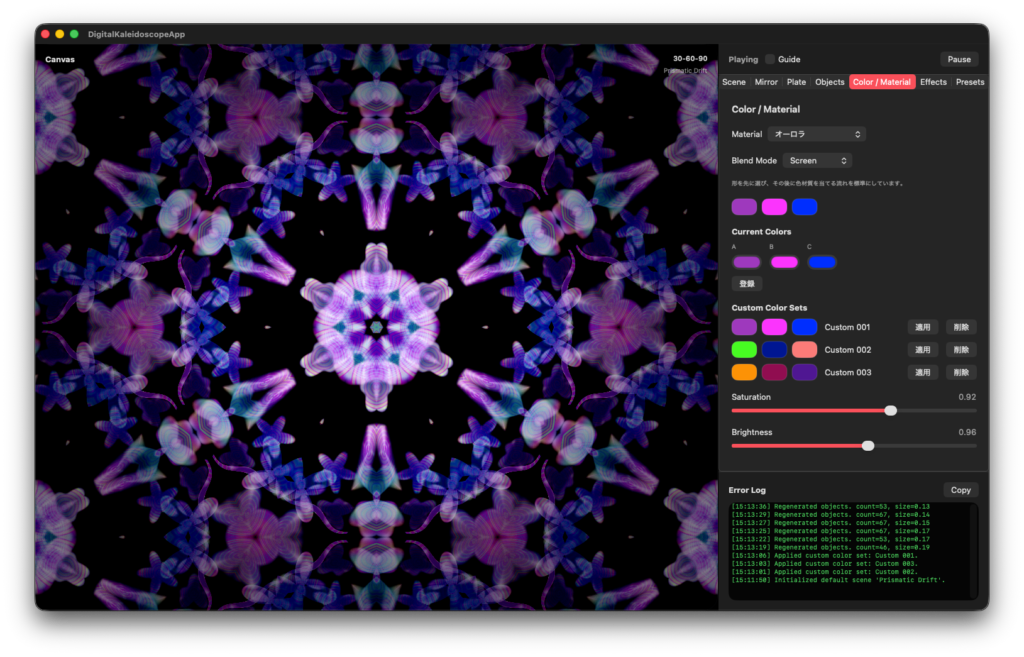 そこで、いつものようにChatGPTに要望を整理してもらい、まずは要件定義を作ることにしました。今回作りたかったのは、macOS上で動くデジタル万華鏡アプリです。画面は左にキャンバス、右にコントロールパネルという構成。操作はタブ式にして、見た目の整理と使いやすさを両立させたいと考えました。ほとんどメニューを使わないので操作が楽です。