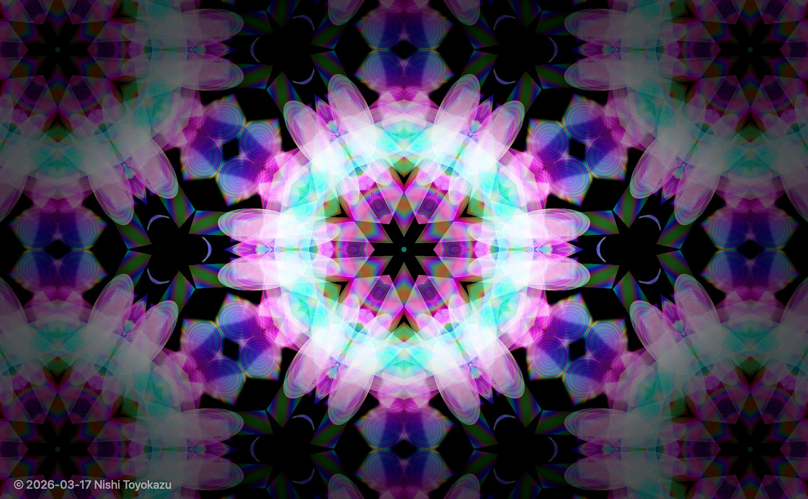 特にこだわったのは、「平面的な図形の繰り返し」に見えないことです。単なる幾何学模様ではなく、本物の万華鏡のように、光がにじみ、重なり、奥行きが感じられること。さらに、グロー効果は必須。色についても、ただの単色ではなく、オパールやシャボン玉、モルフォ蝶の羽のような、見る角度や動きによって印象が変わる偏光色、構造色、干渉色のような表現を取り入れたいと考えました。